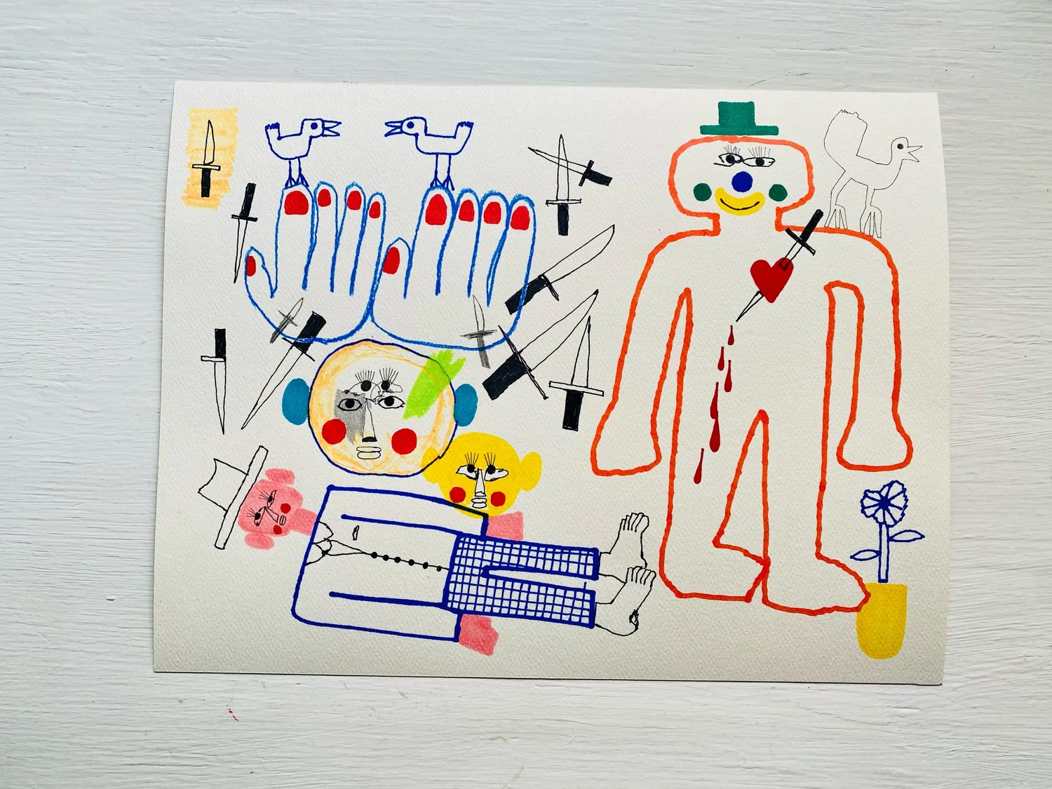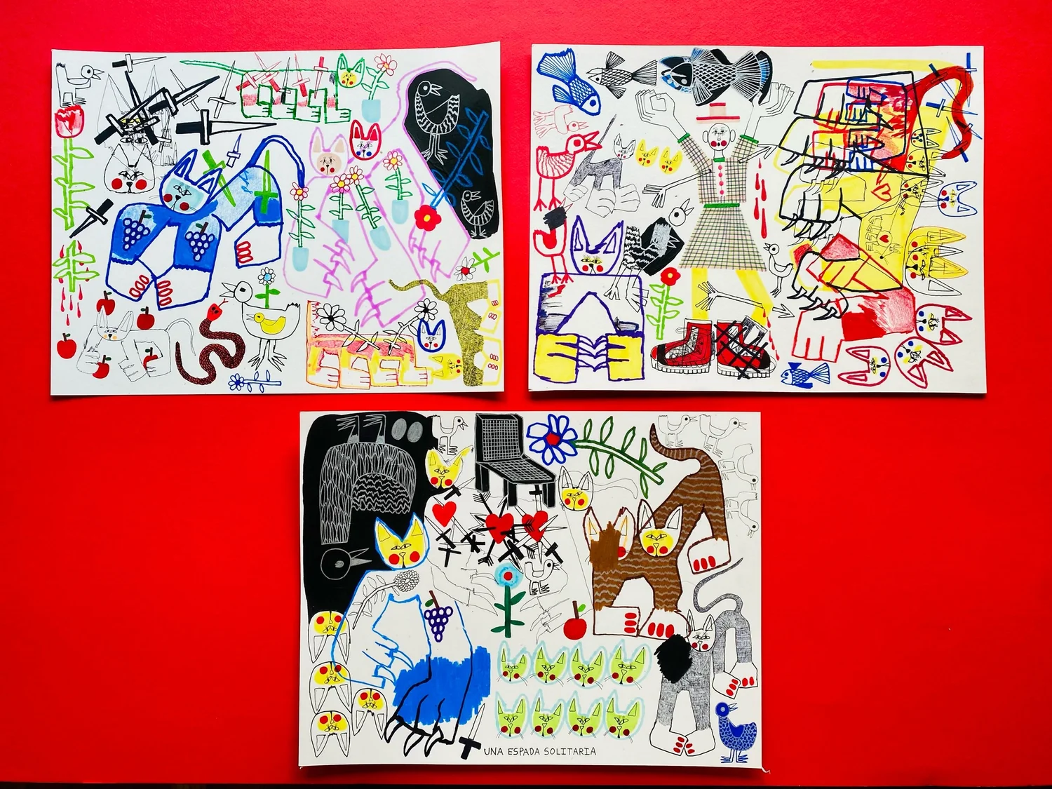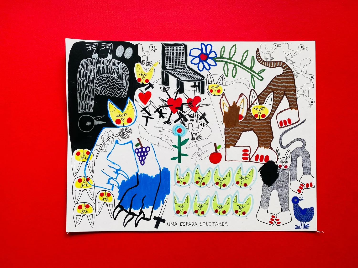 “ Una tortuga y una serpiente cargan a un hombre lastimado por lluvia proveniente de una nube de genitales. Las gotas se sienten como clavos”